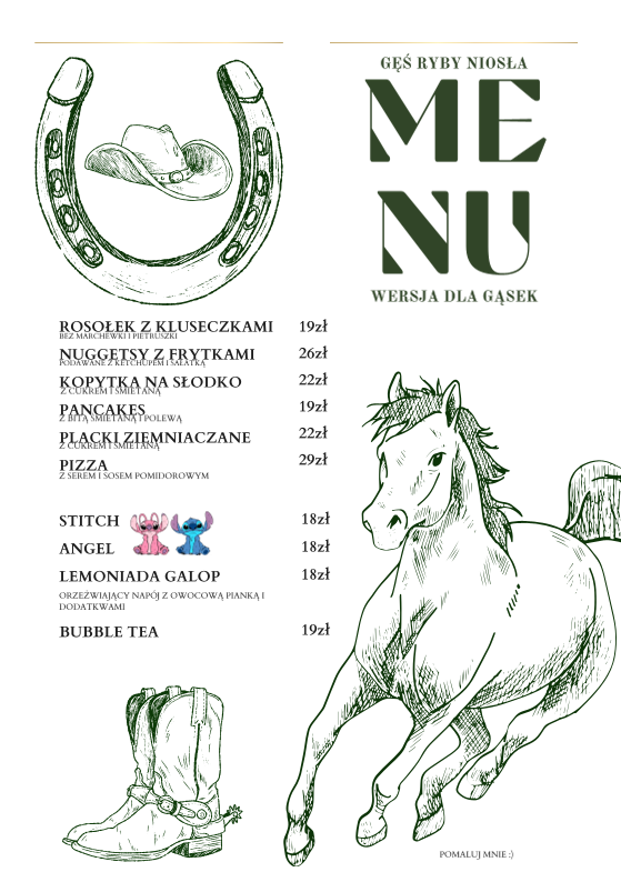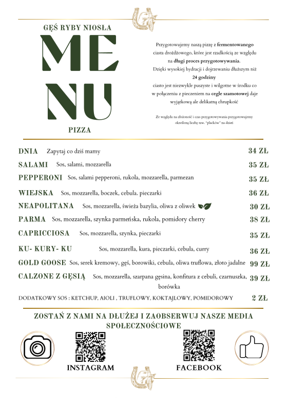 “ Restauracja "Gęś Ryby Niosła" to prawdziwa perełka kulinarna, położona w malowniczej miejscowości Struga, tuż przy stadninie koni – idealne tło dla wyjątkowego doświadczenia gastronomicznego. Już od pierwszego spojrzenia widać dbałość o detale – wystrój jest stylowy, elegancki, a jednocześnie przytulny. Motywy myśliwskie i nawiązania do polowań na dziczyznę dodają wnętrzu charakteru i klimatu, który doskonale współgra z otoczeniem. Jedzenie? Rewelacyjne. Wszystkie dania są nie tylko pięknie podane, ale również świetnie doprawione i przygotowane z wyczuciem. Burger "Wół w bułce" to absolutny hit – soczysty, aromatyczny, perfekcyjnie skomponowany. Pierś z kurczaka pod nazwą "Kurcze zielone" zaskakuje delikatnością i świeżym, ziołowym akcentem. Na szczególne wyróżnienie zasługuje też danie dnia – karkówka w placku ziemniaczanym – miękka, krucha i pełna smaku, dosłownie rozpływa się w ustach. Obsługa jest uprzejma, a atmosfera sprzyja zarówno rodzinnym spotkaniom, jak i romantycznej kolacji. Zdecydowanie warto odwiedzić to miejsce – idealne połączenie wyjątkowej kuchni, oryginalnego wystroju i pięknego otoczenia. ”